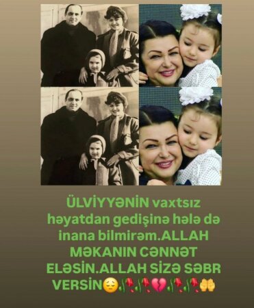 "Ülviyyənin vaxtsız həyatdan gedişinə hələ də inana bilmirəm. Allah məkanını cənnət eləsin. Allah ailəsinə səbr versin".