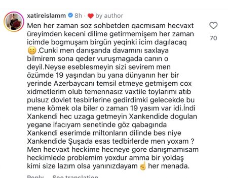 “Hər zaman söz-söhbətdən qaçmışam, heç vaxt ürəyimdən keçəni dilimə gətirməmişəm, hər zaman içimdə boğmuşam. Bir gün yəqin ki, içim dağılacaq. Çünki mən danışanda davamını saxlaya bilmirəm, sona qədər vuruşmağa da canım o deyil. Əsəbləşməyin, sizi sevirəm. Mən özüm də 19 yaşından bu yana dünyanın hər bir yerində Azərbaycanı təmsil etməyə getmişəm, çox xidmətlərim olub. Vaxtilə toylarımı atıb, pulsuz dövlət tədbirlərinə gedirdim ki, gələcəkdə bu mənə kömək ola biler. O zaman 19 yaşım var idi. Xankəndidə doğulan yeganə ifaçıyam, sənətim də göz qabağında. “Xankəndi” əsərim də milyonların dilində. Bəs niyə Xankəndidə, Şuşada əsas tədbirlərdə mən yoxam? Mən heç vaxt, heç kimə nəyəsə görə danışmamışam, heç kimlə də problemim yoxdur. Amma bir yoldaş kimi sizə lazım olsa, yanınızdayam, hər mənada”.