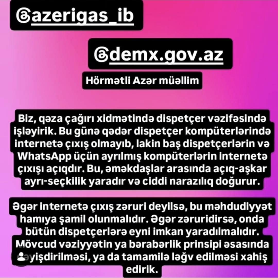 Müraciətdə daha sonra deyilir: "Lakin baş dispetçerlərin və "votsap" üçün nəzərdə tutulmuş kompüterlərin internetə çıxışları açıqdır. Bu hal isə əməkdaşlar arasında ayrı-seçkilik yaratmaqla yanaşı, ciddi narazılıqlara səbəb olmaqdadır.