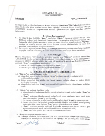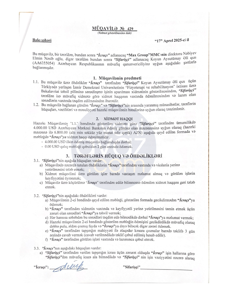 Azad İstehlakçılar Birliyindən Yeniavaz.com-a daxil olan məlumata görə, A.Koyun 17 aprel 2025-ci ildə “Max Group” MMC ilə xaricdə təhsil üçün müqavilə imzalayıb.