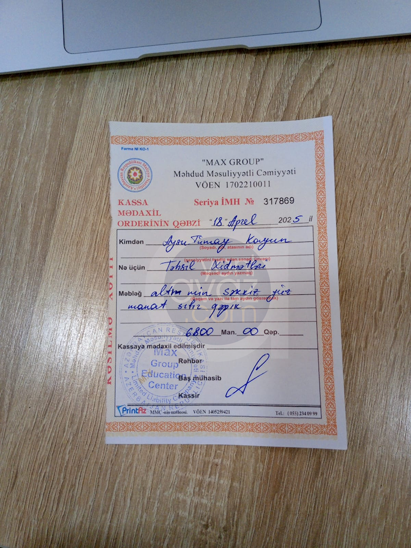 Şikayətçi bildirib ki, göstəriləcək xidmətlərin qarşılığında “Max Group” MMC-yə 6 800 manat məbləğində vəsait köçürüb. Lakin ödənişdən və müqavilədən sonra universitetdən ona heç bir rəsmi qəbul məktubu göndərilməyib.