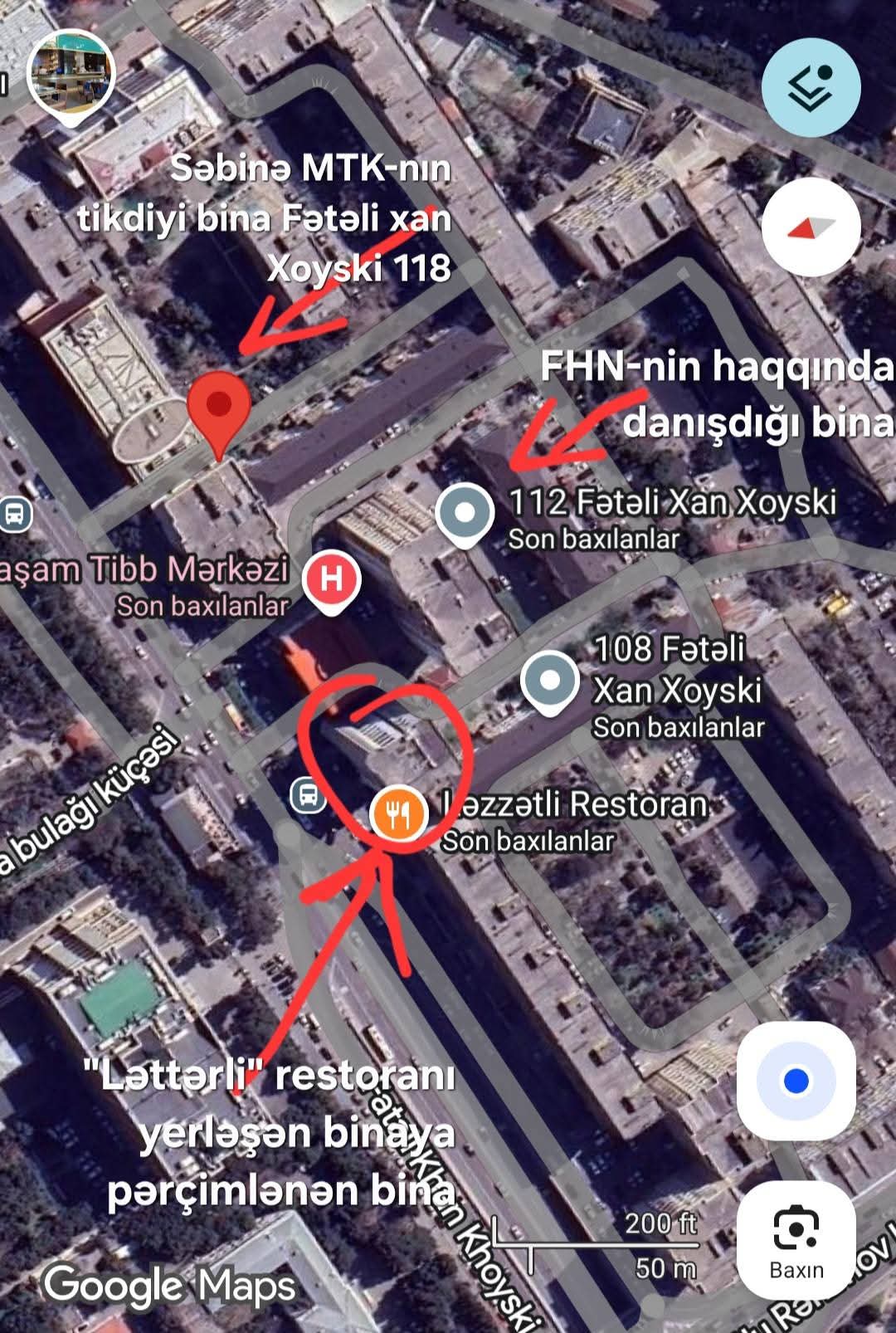 İkincisi, qeyd olunan ünvan azdırıcıdır və sözügedən binaya aid deyil. Sizə heç uzağa getmədən google-map-dan skrin elədiyim şəkli paylaşıram. Hazırda "Azərkreditinvest"in yerləşdiyi pərçimlənmiş binanın ünvanı Fətəli xan Xoyski 108b-dir. FHN "boynundan atdığı" binanın ünvanının 112 olduğunu deyir, hansı ki, ilk mərtəbəsində "Yaşam" klinikası yerləşir və arxa tərəfdə qalır. "Səbinə" MTK-nın tikdiyi binanın ünvanı isə 118-dir, daha aralıdır.