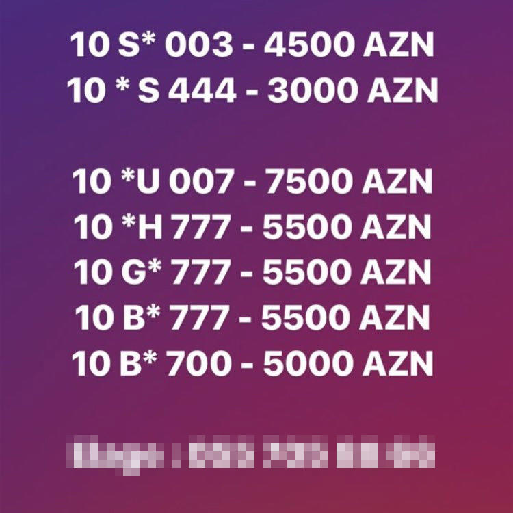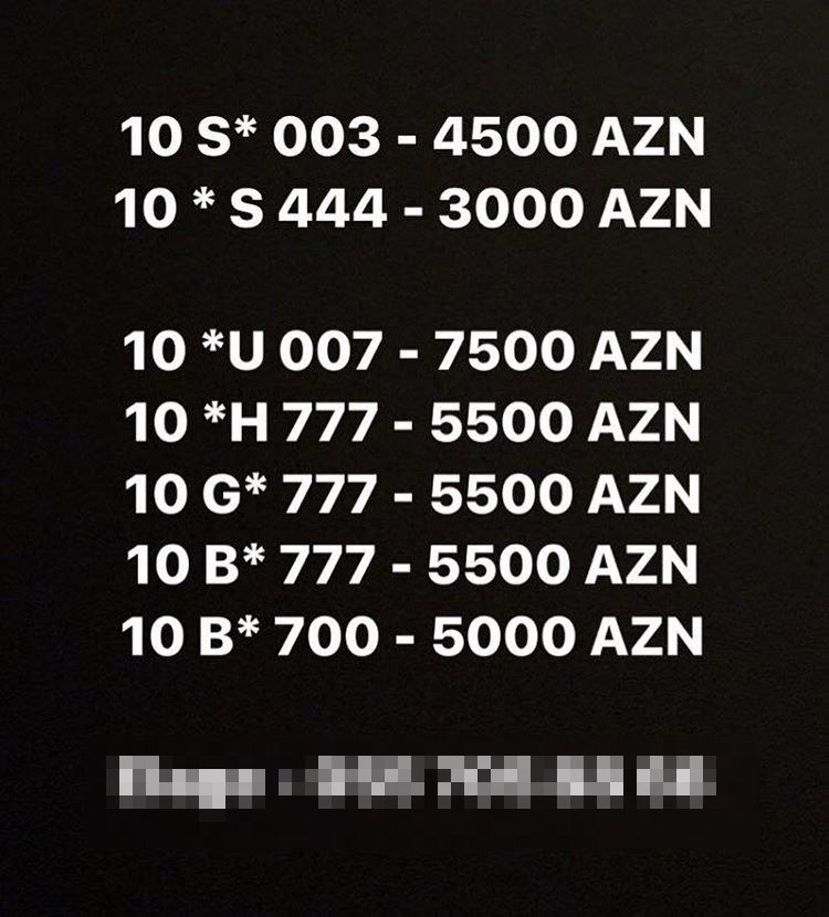 Fərqli seriyalardan olan 001, 002, 003, 004, 005, 006, 007, 008 və 009 kimi nömrələr həmin vaxtdan 1500 manata satılır.