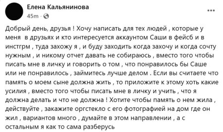 Xahiş edirəm, mənə şəxsi mesaj yazıb “Bu, Saşanın xoşuna gələrdi” və ya “bu, xoşuna gəlməzdi” kimi sözlər demək əvəzinə öz işinizlə məşğul olun. Əgər siz doğrudan da oğlumun xatirəsinin yaşamasını istəyirsinizsə, bu istiqamətdə bir addım atın.