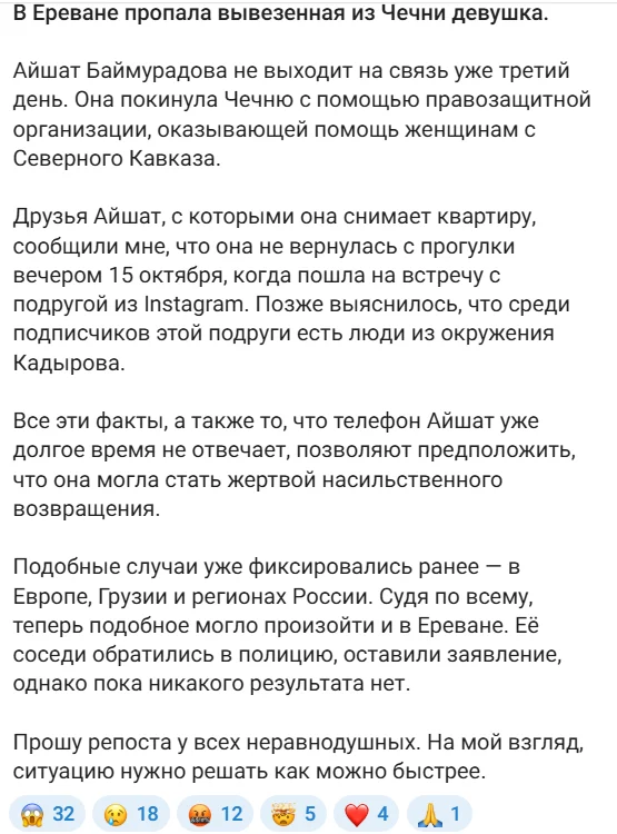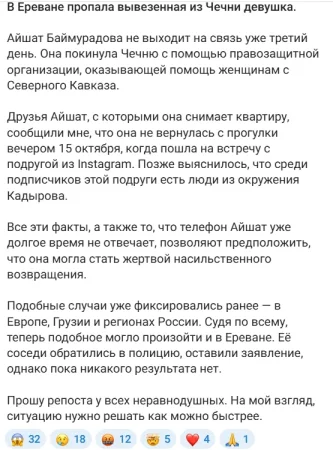 Ermənistan KİV-in məlumatına görə, Baymuradovanın yoxa çıxması barədə oktyabrın 17-də Ermənistanda yaşayan rusiyalı fəal Danil Çebikin məlumat verib. Baymuradovanın eyni mənzildə yaşayan dostları ona deyiblər ki, qız oktyabrın 15-də İnstaqramda tanış olduğu dostu ilə görüşə gedib və bir daha geri qayıtmayıb. “Sonradan məlum oldu ki, bu dostun izləyiciləri arasında (Çeçenistan lideri Ramzan) Kadırovun yaxın çevrəsindən olan adamlar da var”, - Çebikin sosial mediada yazıb.