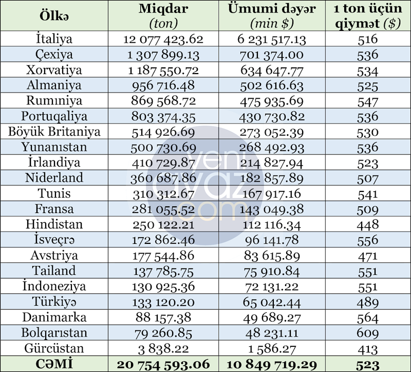 Xam neft miqdar olaraq ən çox İtaliyaya, ən az isə Gürcüstana ixrac edilib. Qiymət baxımından isə ən baha Bolqarıstana (1 ton – 609 dollar), ən ucuz isə Gürcüstana (1 ton – 413 dollar) satılıb.