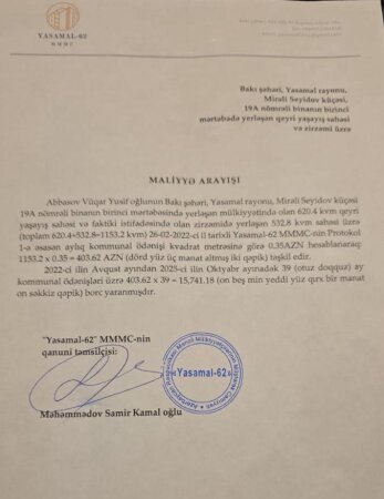 Sənəddə qeyd olunur ki, Abbasov Vüqar Yusif oğluna məxsus, Bakı şəhəri, Yasamal rayonu, Mirəli Seyidov küçəsi 19A ünvanında yerləşən obyekt və zirzəmi sahəsi üzrə uzun müddət kommunal ödənişlər edilməyib. Arayışa görə, 2022-ci ilin avqust ayından 2025-ci ilin oktyabrınadək ümumilikdə 39 ay ərzində kommunal xidmətlərə görə 15 741,18 manat borc yığılıb.