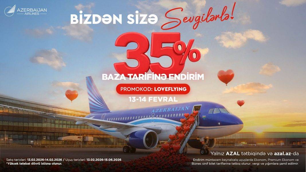 Azərbaycan Hava Yolları Sevgililər Gününü daha da xüsusi etmək üçün baza tarifinə 35% endirim təqdim edir. Bu fürsətlə sevdiyinizlə birlikdə arzuladığınız beynəlxalq istiqamətə səyahət edə bilərsiniz! Belə ki, yalnız azal.az saytından və ya AZAL mobil tətbiqindən aviabilet alarkən “LOVEFLYING” promokodundan istifadə edərək baza tarifinə 35% endirim əldə edəcəksiniz.