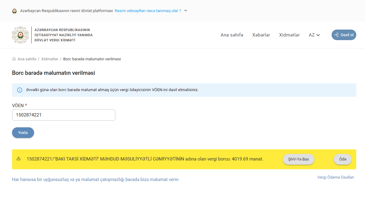Belə ki, Bakı Taksi Xidmətinin Dövlət Vergi Xidmətinin Milli Gəlirlər Baş İdarəsinə 4019.69 manat borcu yaranıb.