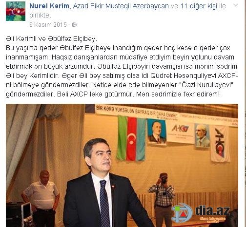 Bu yaşıma qədər Əbülfəz Elçibəyə inandığım qədər heç kəsə o qədər çox inanmamışam. Haqsız danışanlardan müdafiyə etdiyim bəyin yolunu davam etdirmək ən böyük arzumdur. Əbülfəz Elçibəyin davamçısı isə mənim sədrim Əli bəy Kərimlidir. Əgər Əli bəy satılmış olsa idi Qüdrət Həsənquliyevi AXCP-ni bölməyə göndərməzdilər. Nəticə əldə edə bilməyənlər "Ğazi Nurullayevi" göndərməzdilər. Bəli AXCP ləkə götürmür. Mən sədrimizlə fəxr edirəm!” Qeyd olunan linkə nəzər salmaq kifayətdir - https://www.facebook.com/photo.php?fbid=432337483642286&set=pb.100005981144611.-2207520000.1495441249.&type=3&theater