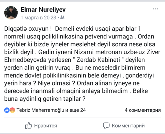Oradan deyiblər ki, bizdə iynələr məsləhətli deyil. Sonra nəsə olsa, bizlik deyil. Gedin iynəni “Nizami” metrosu ilə üzbəüz Zivər Əhmədbəyov küçəsində yerləşən "Zərdab Kabineti " deyilən yerdən alın gətirin, vuraq . Bilmirəm, bu, nə məsələdir? Dövlət poliklinikasının belə deməyi, göndərdiyi yerin hara və niyə olması, oradan alınan iynəyə nə dərəcədə inanmalı olmağımızı anlaya bilmirəm”.
