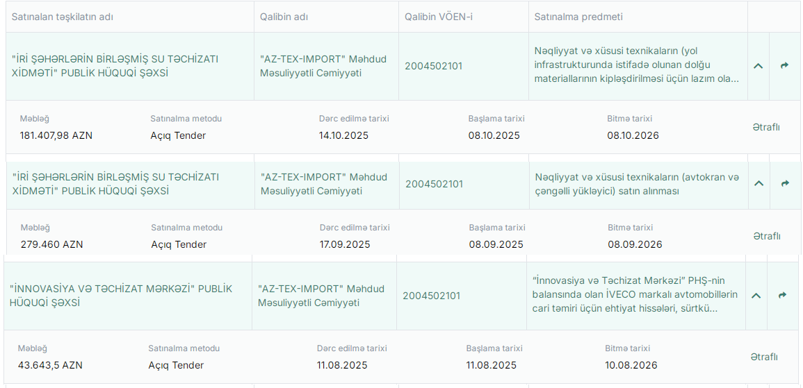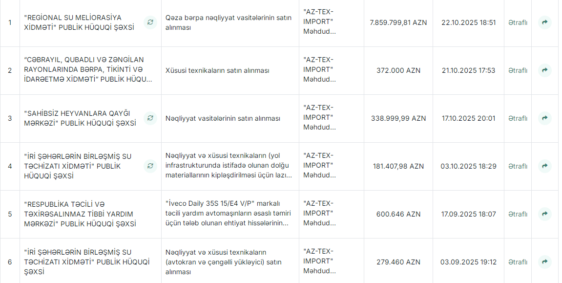 Bundan başqa, “AZ-TEX-IMPORT” MMC “İnnovasiya və Təchizat Mərkəzi” publik hüquqi şəxs ilə də müqavilə imzalayıb. Sazişə əsasən, mərkəzin balansında olan İVECO markalı avtomobillərin cari təmiri üçün ehtiyat hissələri, sürtkü yağları və digər malların alınması nəzərdə tutulur. Müqavilənin məbləği 43.643,5 manatdır.