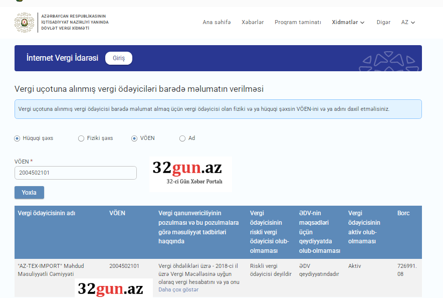 “AZ-TEX-IMPORT” Məhdud Məsuliyyətli Cəmiyyətinin dövlətə külli miqdarda vergi borcu üzə çıxıb.