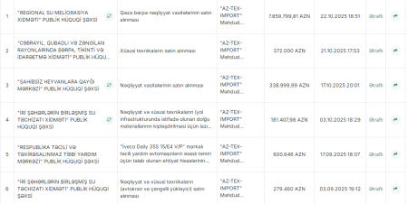 Maraqlıdır ki, bu qədər böyük borcu olmasına baxmayaraq, “AZ-TEX-IMPORT” MMC oktyabr ayında 3 tender müqaviləsi bağlayıb, daha 4 tenderdə isə qalib elan olunub. Bağlanmış müqavilələrdə ümumi məbləğ: 504.511,48 manatdır.