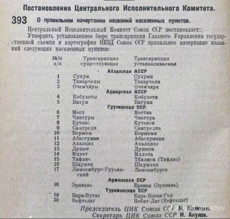 “Bu sənəd məhz 1936-cı ildə SSRİ MİK-i tərəfindən İrəvan şəhər adının Yerevan adı ilə əvəzlənməsini, Tiflis adının isə Tbilisi adı ilə əvəz edilməsini əyani şəkildə təsdiq edən sənəddir.