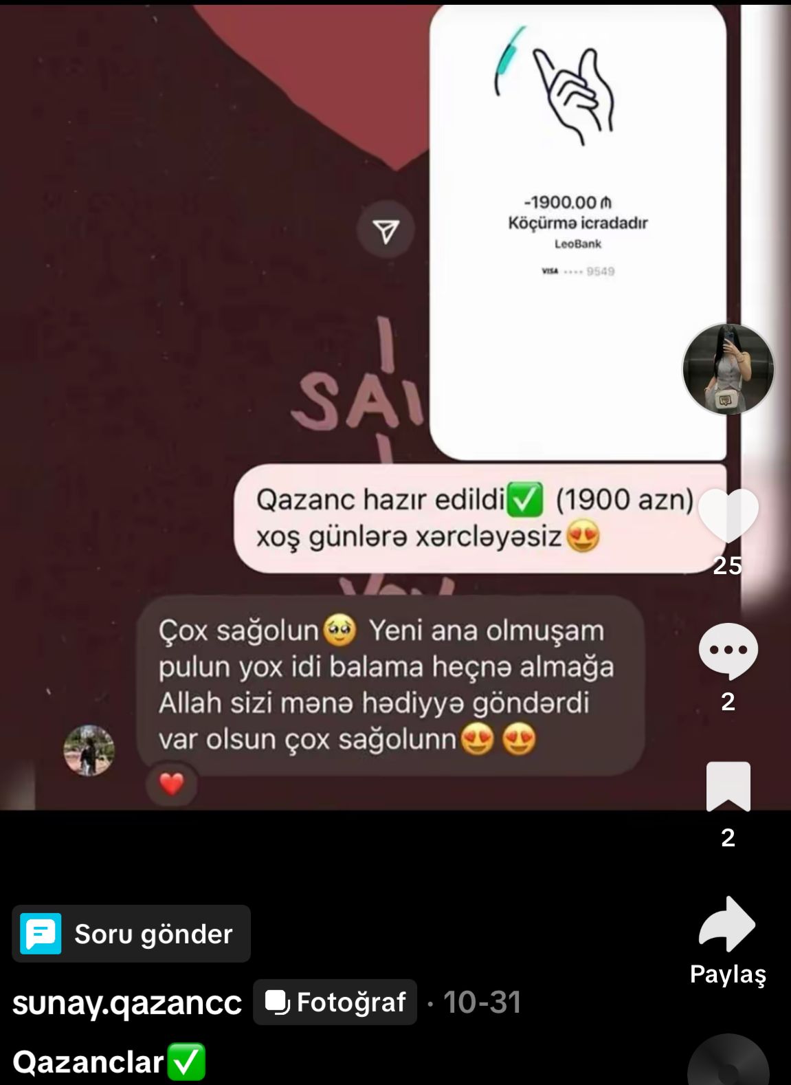 Apardığımız araşdırma zamanı bəlli oldu ki, səhifədə paylaşılan “qazanc sübutları” saxtadır. Paylaşımlarda guya bəzi istifadəçilərin kart hesabına 500, 700, 1900 manat pul köçürüldüyü göstərilir.