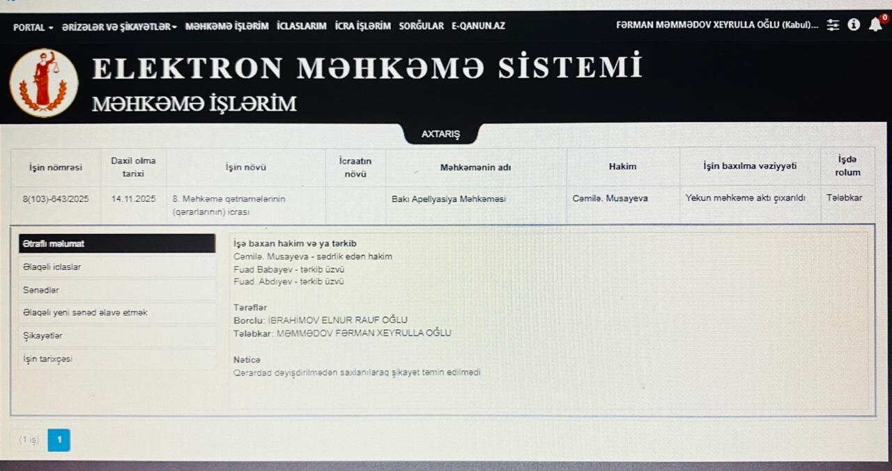 Xüsusilə külli miqdarda dələduzluq etmiş Elnur İbrahimov barəsində Nəsimi rayon Məhkəməsi icra məmurunun təqdimatı əsasında STOP qoyub. Elnur İbrahimov bu qərardan narazı qalıb, ölkədən getmək istəyi ilə Bakı Apellyasiya Məhkəməsinə üz tutub. Hakim Cəmilə Musayevanın sədrliyi ilə Elnur İbrahimovun apellyasiya şikayətinə baxılıb. Məhkəmə şikayəti təmin etməyib.