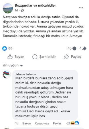 "Naxçıvan dovğası adı ilə dovğa satılır. Qiyməti də digərlərindən bahadır...." "DİA-AZ" xəbər verir ki, bu barədə "Müştəriyəm Şikayətim Var" sosial qrupundakı paylaşımda giley olunur.