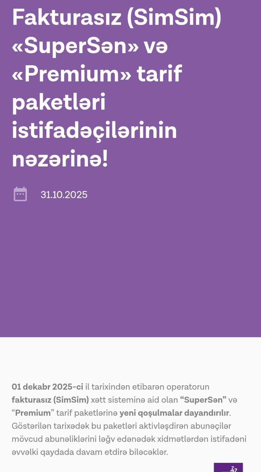 “Azercell” 1 dekabr tarixindən etibarən fakturasız (SimSim) xətt sisteminə aid olan “SuperSən” və “Premium” tarif paketlərinə yeni qoşulmaları dayandırır.