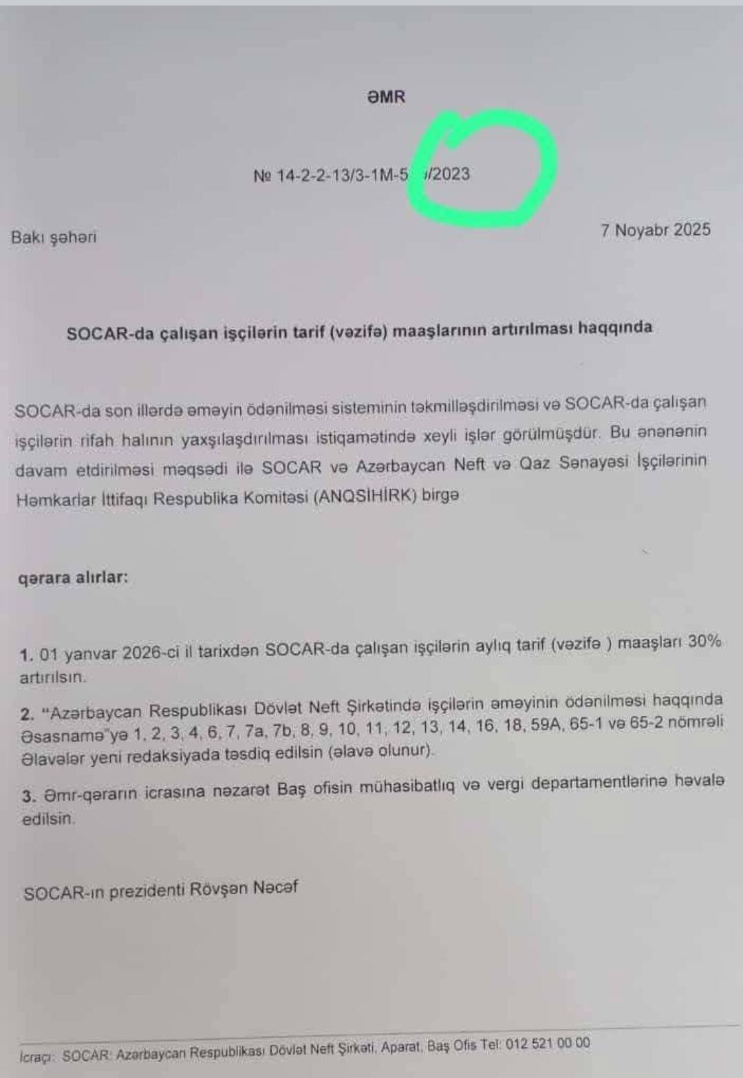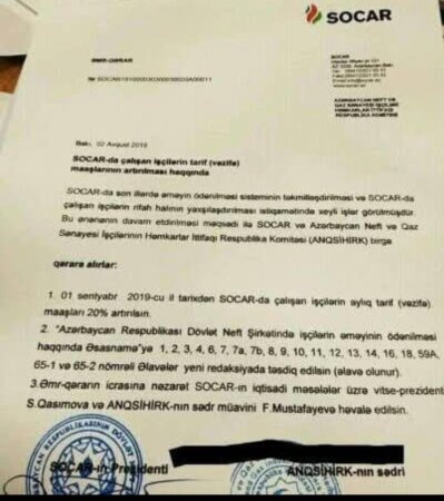 Qanunla şirkətdə aparılan kütləvi ixtisarlar, işdən qeyri-qanuni çıxarmalar onsuz da Həmkarlar Təşkilatı ilə razılaşdırılır. O cümlədən, əmək haqlarını artıranda da göstərilir ki, Həmkarlar Təşkilatı ilə bir yerdə qərar qəbul edirlər. Yəni bu əmr, qərar olmalıdır, altından da Dövlət Neft Şirkətinin prezidenti, Neft və Qaz Sənayesi İşçiləri Həmkarlar Təşkilatı qol çəkməlidir. Kağızın formatı da düz deyildi. Bizim mütəxəssislər də baxdılar ki, sənəd saxtadır.