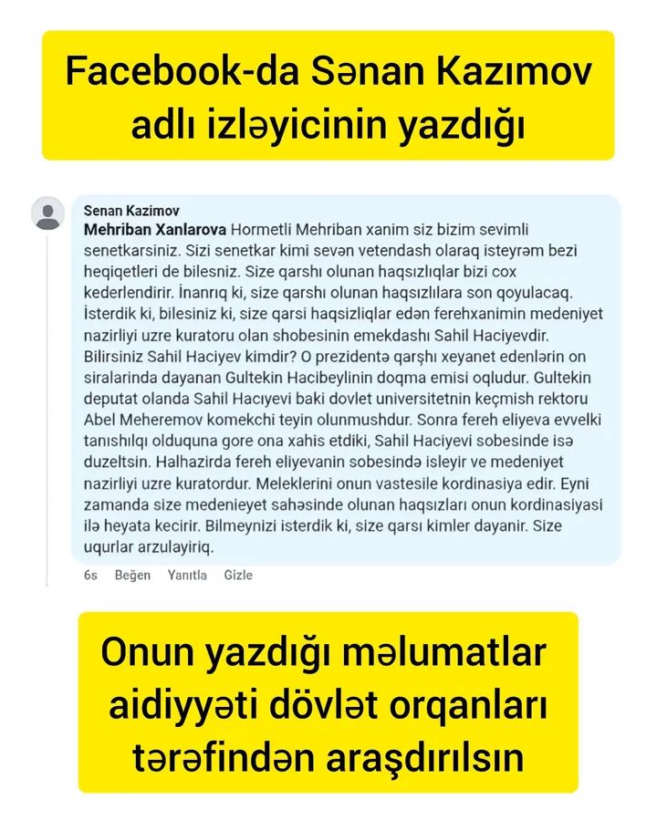 "Facebook-da mənə bir izləyici tərəfindən yazılan məlumatı sizinlə bölüşmək istəyirəm. O, mədəniyyət sahəsində baş verən haqsızlıqların pərdəarxasında kimlərin dayandığı ilə bağlı ciddi iddialar səsləndirib..." "DİA-AZ" xəbər verir ki, bunu özünün sosial şəbəkə hesabında paylaşan əməkdar artist Mehriban Xanlarova qeyd etdiyi mənbəyə istinadən olduqca ilginc faktları təqdim edib.