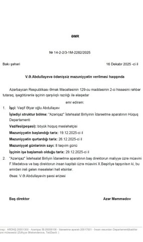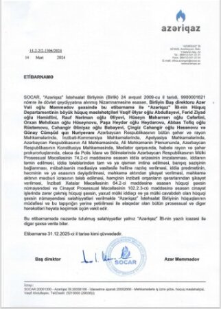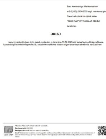 İş Nizami məhkəməsindən “aidiyyatı” Bakı Kommersiya Məhkəməsinə göndərilib və eyni hakimin (Günay Namazova) icraatına verilib. Cavabdeh “Azəriqaz” ın bu məhkəmədə “oyun havaları” süründürməçiliyə yeni meydan verib. Məhkəmə işi aidiyyatı üzrə ümumi məhkəməyə qaytarmaq əvəzinə həftədə bir dəfə hazırlıq iclası təyin edir. Süründürməçilik iclaslarına “qazı” cavabdeh “Azəriqaz” vurur”. “Azəriqaz”ın rəhbərinin “topdan” 10 nəfəri 1-ci dərəcəli Qarabağ qazisinəqarşı VƏKİL (?- yalnız VK üzvləri bu addan yararlana bilər, başqasının vəkil adından istifadəsi 800 manat cəriməyə səbəb olur)etdiyi işçilərindən Vaqif Abdullayev19.12.2025-ci ilə təyin olunan hazırlıq iclasının ödənişsiz məzuniyyətdə olması səbəbindən növbəti ilə- 08.01.2026-cı ilə keçirilməsinə nail olub. Məhkəmənin “qaz havası”na qol götürüb oynamağına” baxın, “Azəriqaz” İB-nin baş direktoru Azər Məmmədov 16.12. 2025-ci il tarixli əmrləVaqif Abdullayevi19.12.2025-ci ildən (?-ikinci iclas bu tarixə təyin olunub) ödənişsiz məzuniyyətə göndərib və onun məhkəməyə məzuniyyətini pozmamaq ərizəsini hakim təmin edib. (?) Bəyəm 10 nəfər vəkil ediləndən yalnız Vaqif Abdullayevın iştirakı məcburidir, başqası məhkəməyə sifarişi yerinə yetirə bilməz? Açıq-aşkar məhkəməyə hörmətsizlik, süründürməçilik göz önündə olsa da, məhkəmə nə süründürməçiliyə son qoyur, nə işin aidiyyatının pozuntusuna. Heç bir il qabaq 19.12.2024-cü il tarixli aktla Nizami məhkəməsinin 1-ci dərəcəli Qarabağ əlilinə 6 saylı vəkil bürosundan ayırdığı vəkilin xidmətdən imtinasına da qiymət verən yoxdur.