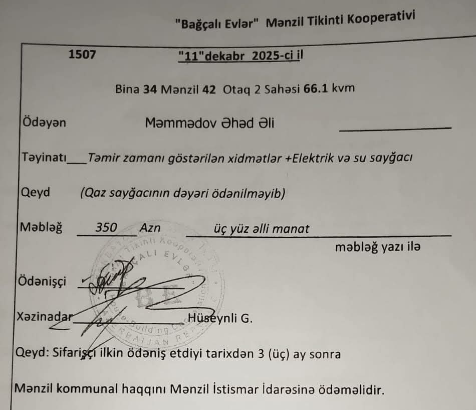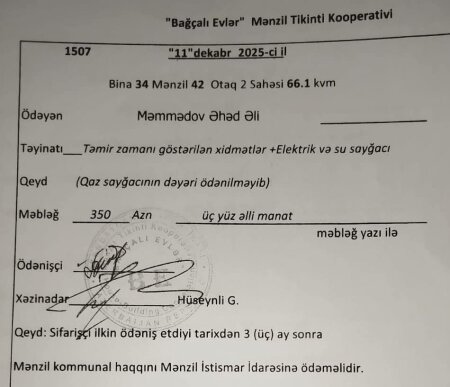Narazı vətəndaş daha sonra bildirir: "İndi evi satıram deyə bunu zorla aldılar, ancaq izah sənəddəki səbəblə uyğun gəlmir. Şifahi olaraq deyirlər ki, yeni sahibinin adına sayğacları dəyişmək üçündür, evi alan da bu sənədə baxıb bu məbləği vermir ki, "təmir zamanı" yazılıb, deyir ki, sənlikdir. İndi bunun açıqlaması nədir? Kimə şikayət edək? Belə özbaşınalıq olar? Ürəkləri nə istəyir, onu da edə bilərlər? Bu da ödənməsəydi, kupçaya müraciət etmək üçün tələb olunan sənədi vermirdilər, biz də kupçanı ala bilməyəcəkdik.