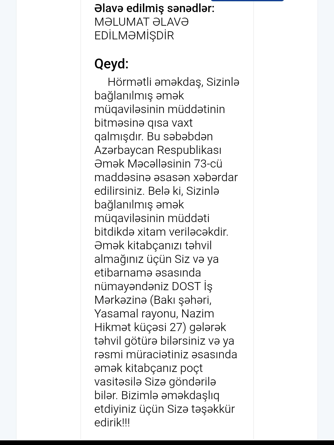 Son günlər DOST MMC vasitəsilə müxtəlif dövlət və özəl qurumlarda çalışan bir qrup Vətən müharibəsi veteranına əmək müqavilələrinin müddətinin başa çatması ilə bağlı rəsmi bildirişlərin göndərildiyi bildirilir.