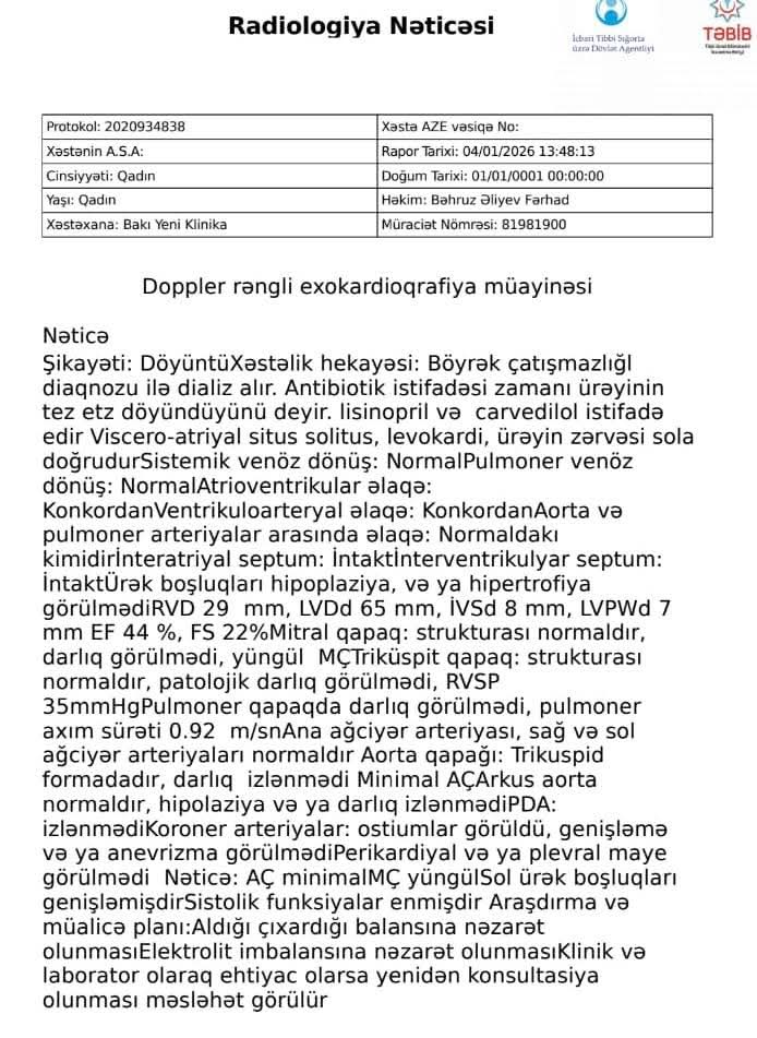 Rəsmi exokardioqrafiya nəticələri göstərir ki, xəstənin ürək atılma fraksiyası (EF) 44%-ə düşüb və sistolik funksiyalar enib. Bu, dializ alan bir uşaq üçün həyati təhlükə deməkdir. Belə kritik bir məqamda sənədləşməni belə dürüst apara bilməyən bir personalın müalicə taktikasının doğruluğuna kim zəmanət verə bilər?