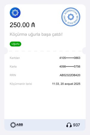 Narazı vətəndaş daha sonra bildirir: "20 avqust 2025-ci il tarixində, saat 11:33-də ABB bank kartından mənim Leo Bank kartıma 250 manat köçürülüb. Göndərən tərəfin kartından pul çıxıb və ABB bank tərəfindən ödəniş çeki də təqdim olunub.