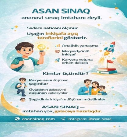 "ASAN SINAQ sınaqdan daha çox şagirdin inkişafına fokuslanır: mövzular üzrə güclü və zəif tərəfləri göstərir, şagirdin inkişaf dinamikasını məqsədyönlü izləməyə imkan yaradır.