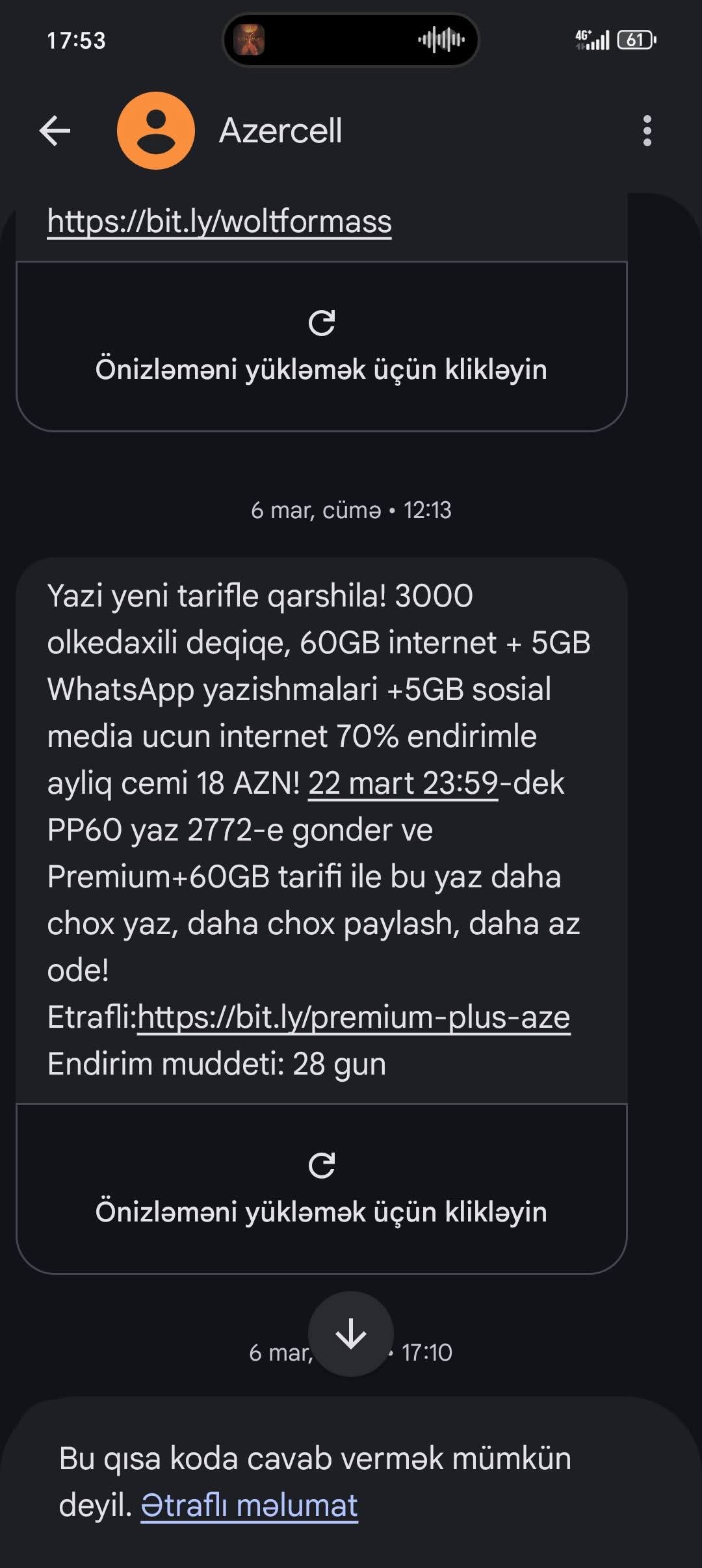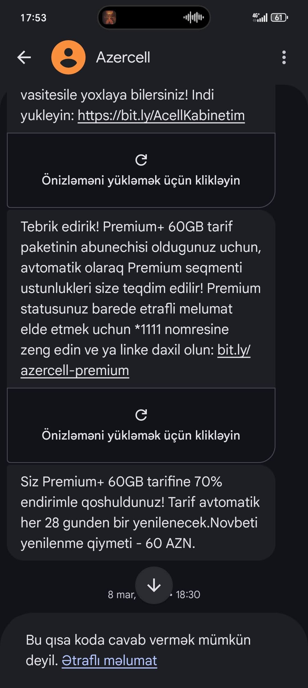 Keçən ay sms ilə daha da sərf eləyən təklif göndərdilər. İlk mesajda tarifin növbəti aylarda qiymətinin 60 manat olacağı barədə məlumat qeyd olunmamışdı və mən də qəbul etdim. Paket aktiv olunandan sonra gələn smsdə sonda qeyd olunub ki 60 manat olacaq növbəti aylarda.