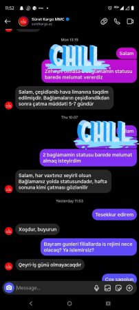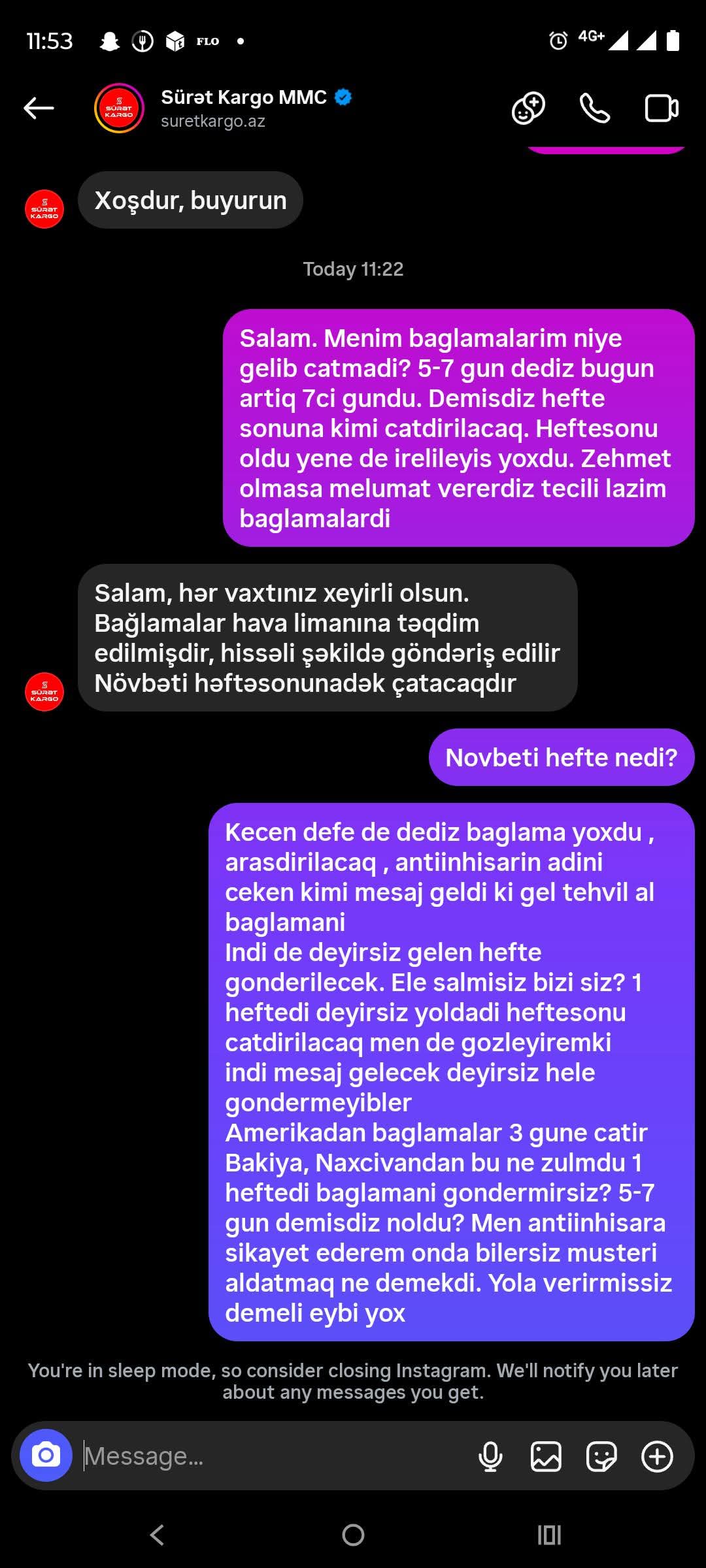 Narazı vətəndaş daha sonra bildirir: "Mərkəzi anbarları Naxçıvandadı, Türkiyə sifarişləri ora çatdırılır, ordan da çeşidlənib 5-7 gün ərzində təyyarə ilə Bakıya çatdırılır. İlk sifarişimdə 7 gün tamamlandı, dedilər bağlama barədə məlumat yoxdur, itib-batıb... nə olub, bilinmir, araşdırılacaq. Dedim, 200 qramlıq bağlama deyil, 5 kq-lıq bağlama necə itə bilər. "Antiinhisar"la hədə-qorxu gəldim bunlara... 5 dəqiqə sonra sms geldi ki filialdadı, gəl təhvil al. Eyni vaxtda başqa sifarişim var idi, o da 1 həftədir yolunu gözləyirəm, dedilər 5-7 günə çatdırılacaq Bakıya. Bu həftə sonu üçün dedilər, çatdırılacaq. Mən də həvəslə gözləyirdim, bayaq yazmışam ki status nədi, deyir hələ yola salınmayıb, gələn həftə çatacaq. Bu ne özbaşınalıq, nə məsuliyyətsizlikdir? Hətta "Starex" belə bunlardan dəqiq işləyir. Yazışmaların hamısını atacam, görün, bunların işbilməzliyini..."
