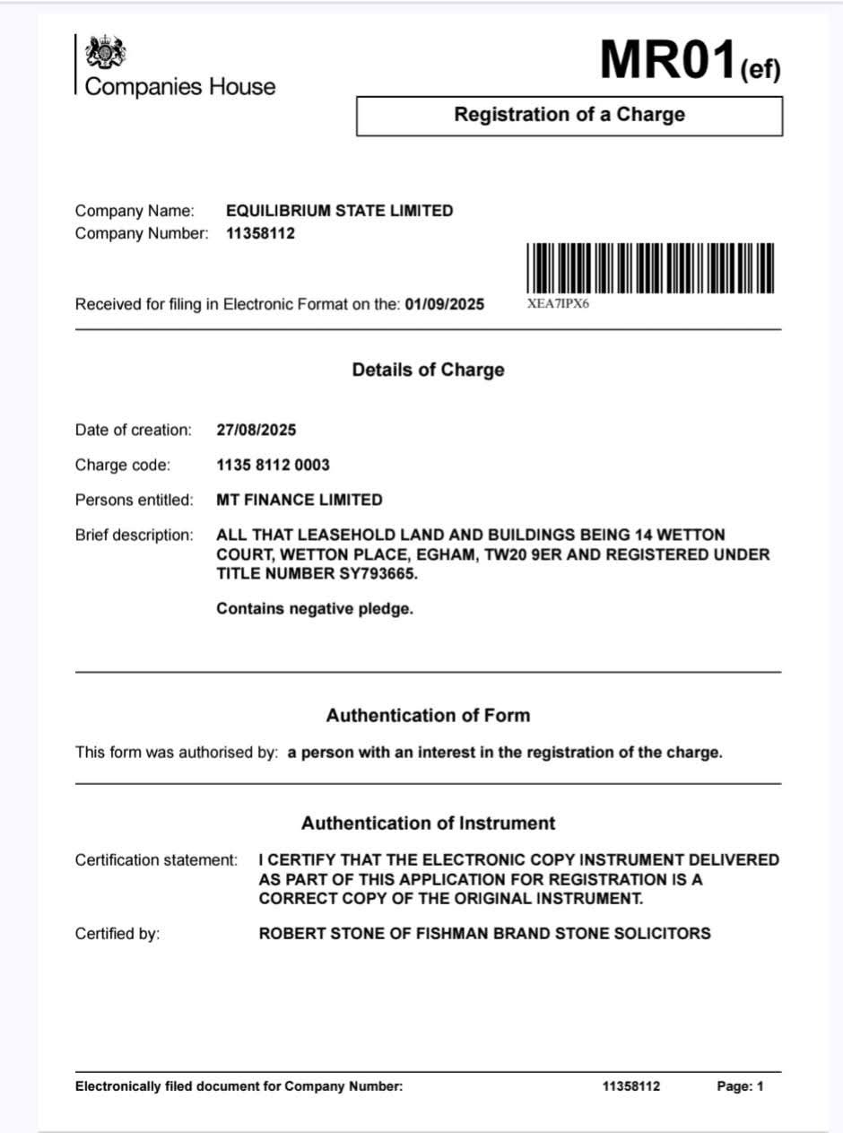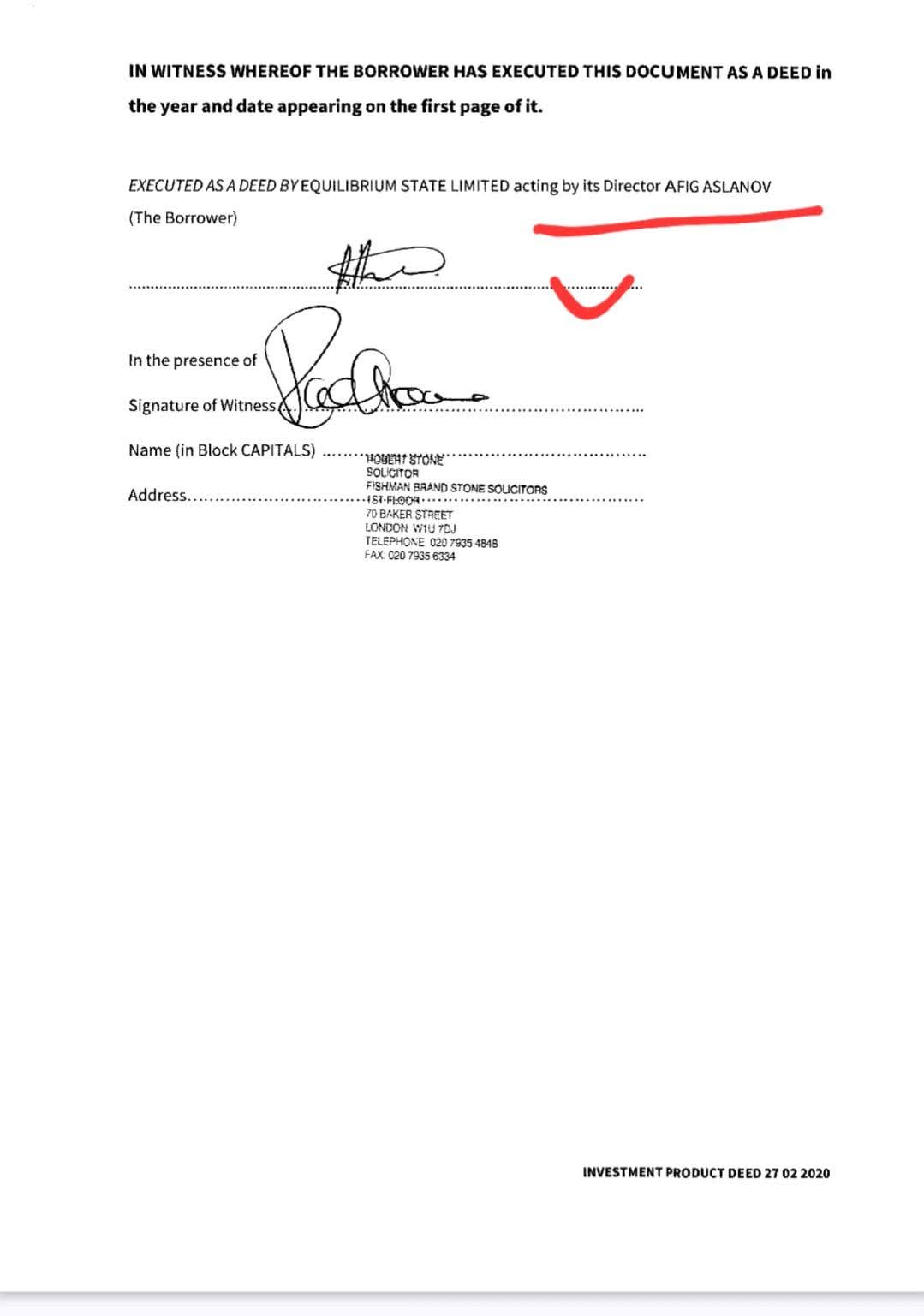 O daha sonra bildirir: "Aşiq Aslanov avqustun 27-də İngiltərənin MT FINANCE LIMITED şirkətindən yüksək faizlə (10.2 % Avropa üçün yuxarı göstəricidir) 1 il ərzində geri ödəmək şərtilə 235 min 950 funt (530 min manata yaxın) pul götürüb. Bu kredit Egham şəhərindəki 1a Wetton Court (Title No. SY793665) ünvanındakı daşınmaz əmlak üzərində girov (charge) yaradılması ilə təmin edilib.
