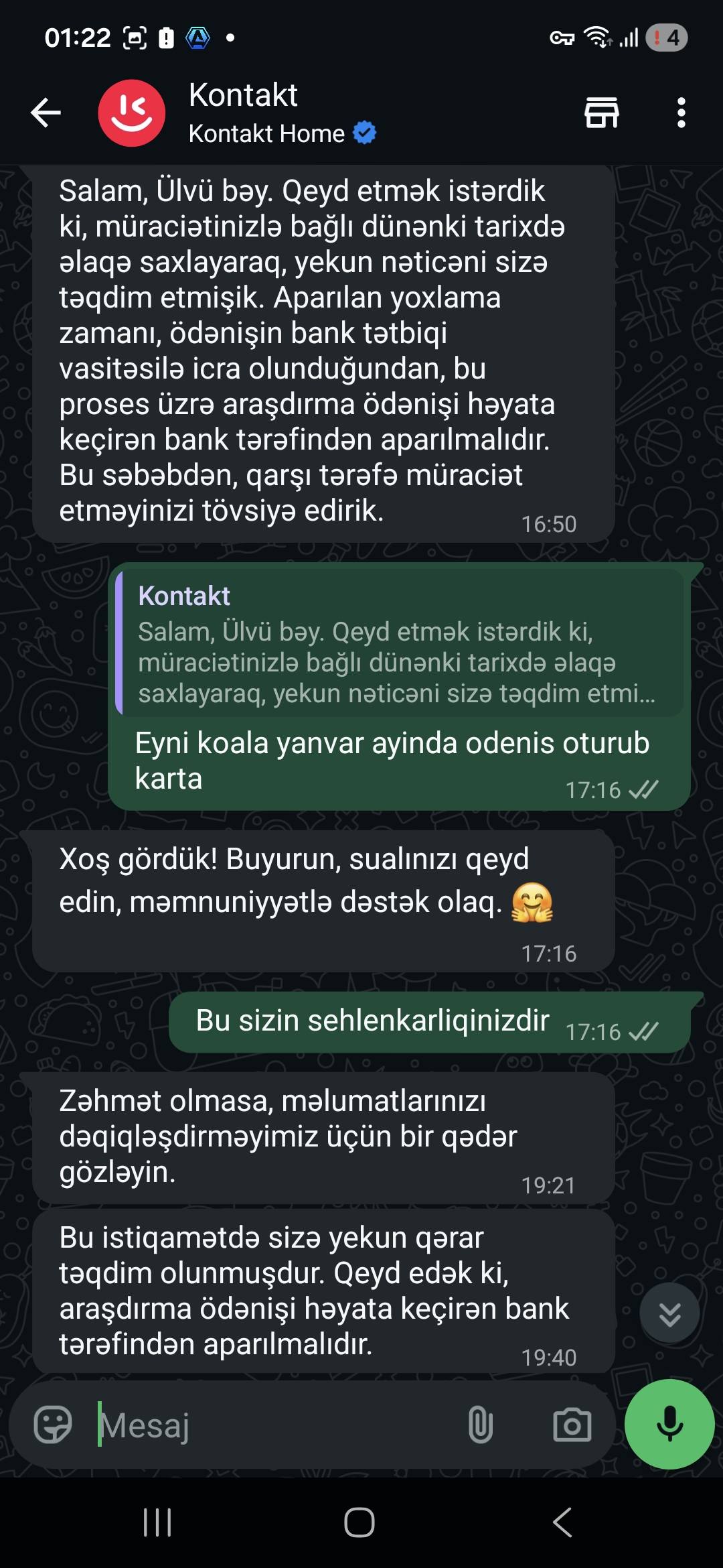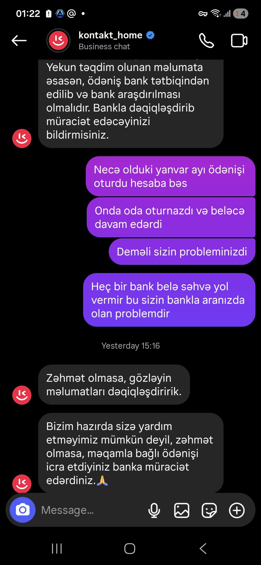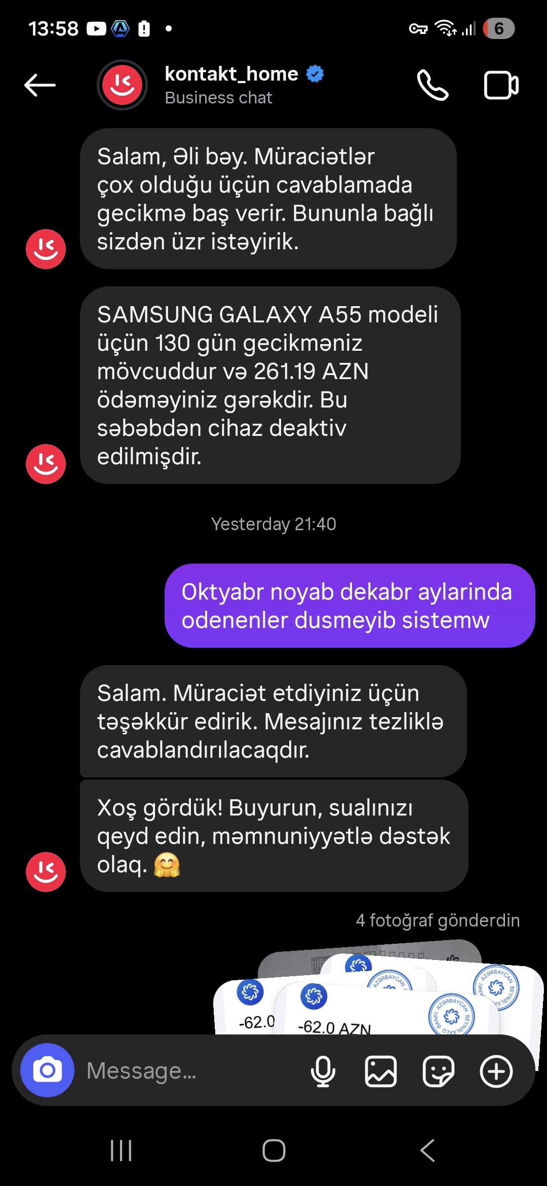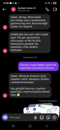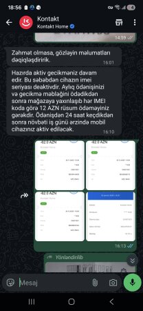 "Keçən ilin mart ayında "Kontakt Home" Sabirabad filialından kredit ilə alınan aylıq ödəniş məbləği 62 manat nəzərdə tutulan mobil telefonumun hər ay vaxtında ödənişləri olunmasına baxmayaraq 4 gündür deaktiv ediblər cihazı..." "DİA-AZ" xəbər fverir ki, bu barədə "Müştəriyəm Şikayətim Var" sosial qrupundakı paylaşımında Əli Qasımov adlı istifadəçi gileylənir.