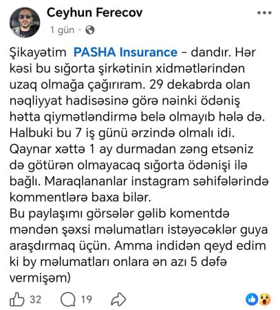 Tribuna.az xəbər verir ki, bu barədə sözügedın sığorta şirkətinin müştərisi Ceyhun Fərəcov yazıb. O bildirib ki, ötən ilin dekanrından baş verın hadisəyə görə” PASHA Insurance” şirkətindən ödəniş ala bilmir:”29 dekabrda olan nəqliyyat hadisəsinə görə nəinki ödəniş, hətta qiymətləndirmə belə olmayıb hələ də.