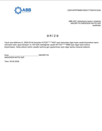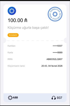 "Mən Nəcmiyyə Sədizadə Natiq qızı səhvən öz ABB kartımdan Leobank kartına rəqəmin hər hansı birini yanlış yazdığıma görə 100 manat pul köçürmüşəm..." "DİA-AZ" xəbər verir ki, bunu narazı vətəndaş özünün sosial şəbəkə hesabında paylaşıb.