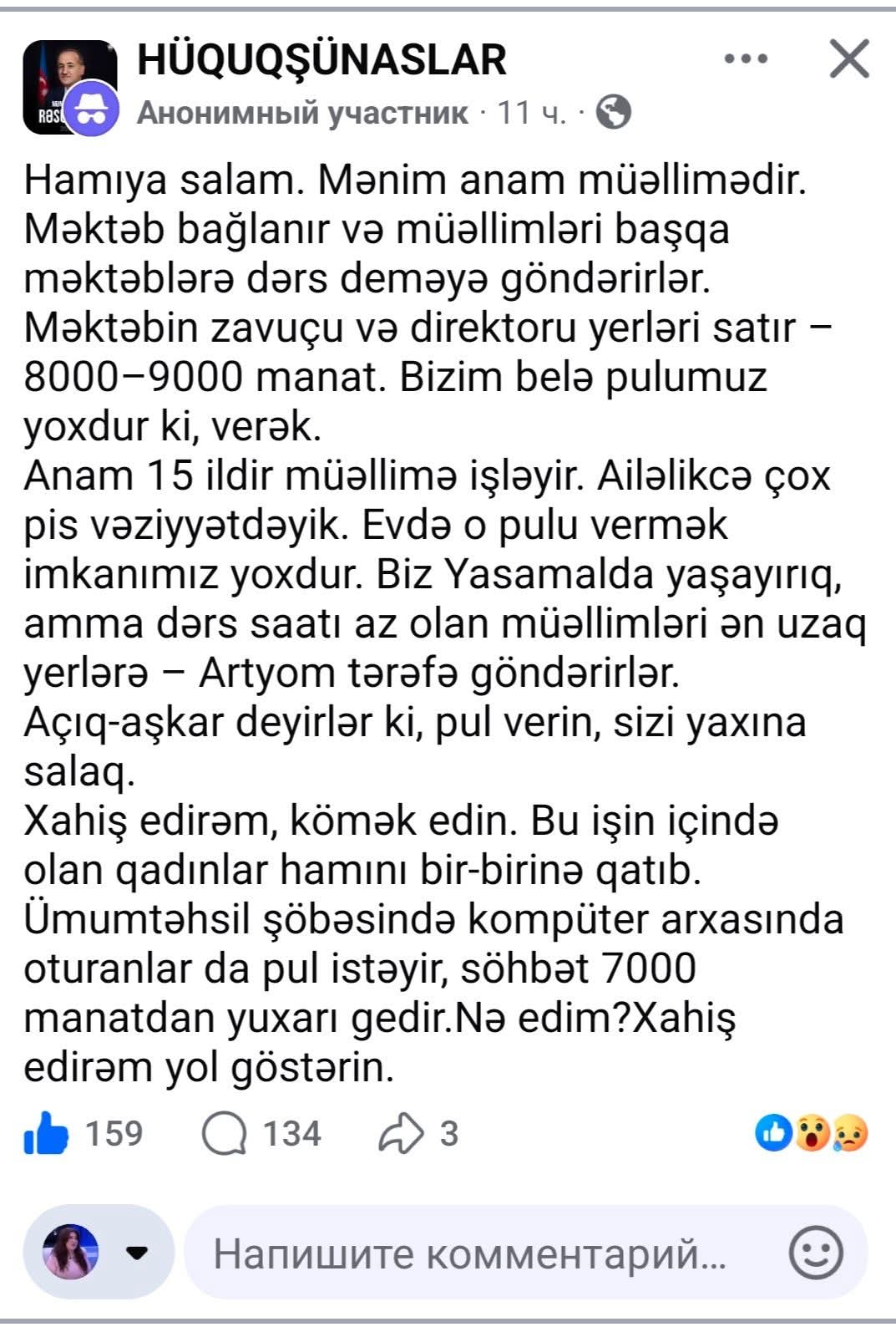 "Yəni transfer edilir. Direktor yaxın və uyğun iş yerlərini 8000-9000 manata satır. Tələb olunan pulu verməyə gücü çatmayan müəllimə Yasamaldan Artyom adasına göndərəcəyini deyib. Bunun adı konkret sürgündür.