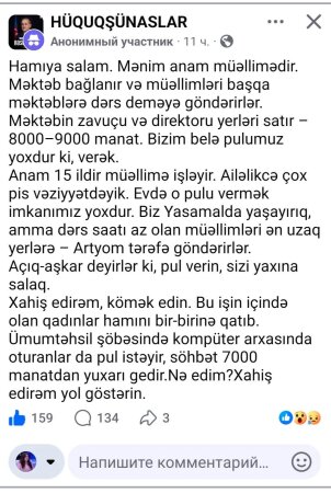 Bu şikayəti yazanın anası sözügedən məktəbdə 15 ildir müəllim işləyir. Övlad anası üçün narahatdır, nigarandır. Yazıb ki, yaxın məktəblərin birində iş yerini almağa pulları yoxdur. Hara, kimə və necə şikayət edəcəklərini bilmirlər.